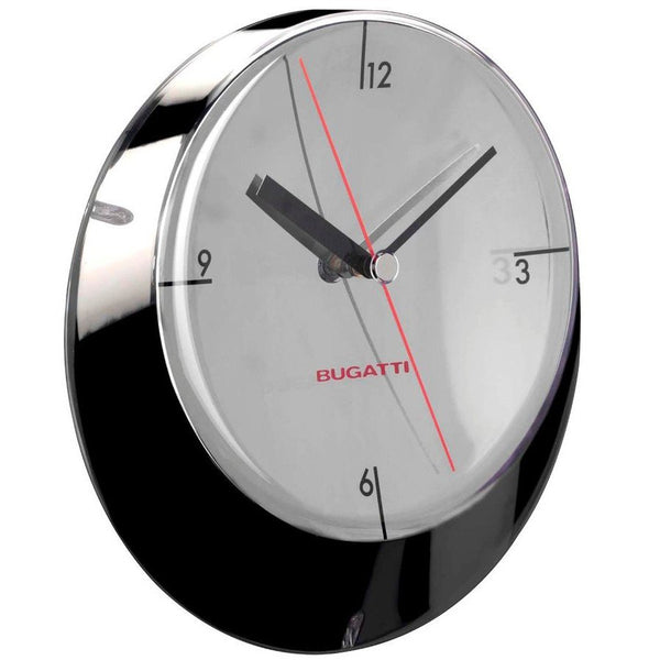 A bold piece of Italian Design from Casa Bugatti! The chrome and white Glamour wall clock is a truly unique time-piece. The striking chrome case contrasting with the white face make it very eye catching indeed. The top of the case is at a right angle to the clock face but as you move down to the bottom of the case, it becomes more of a gradient. This is what gives this modern clock its unique design. The clock face is a slick minimal design and the second hand spanning the entire face of the clock is a nice touch.